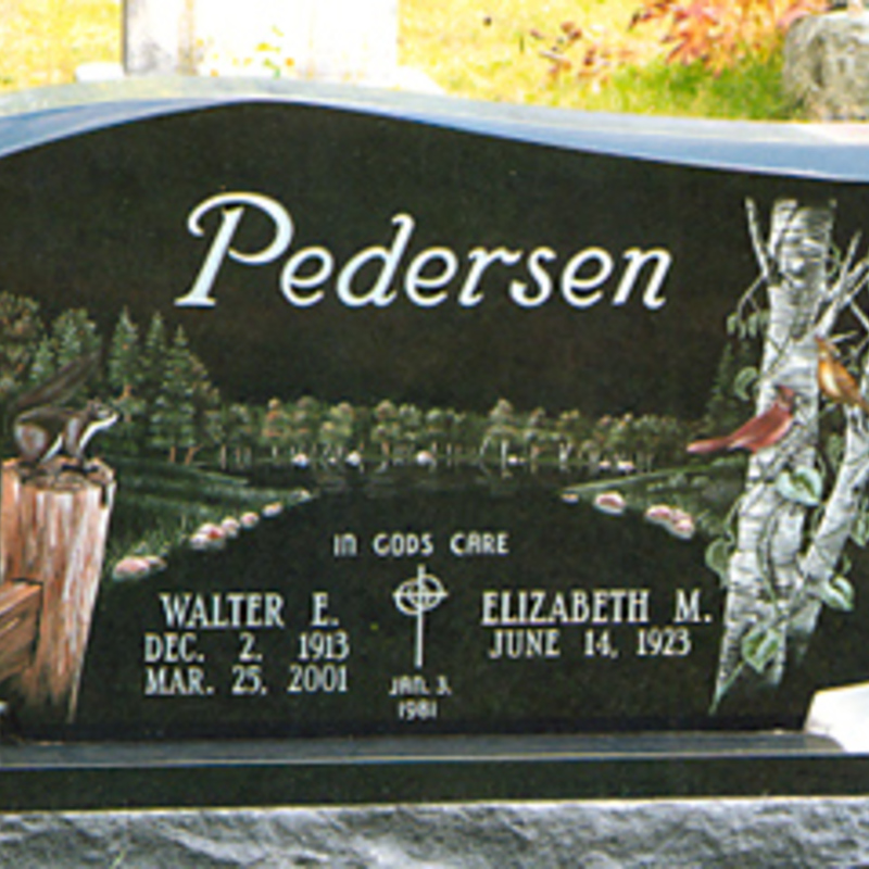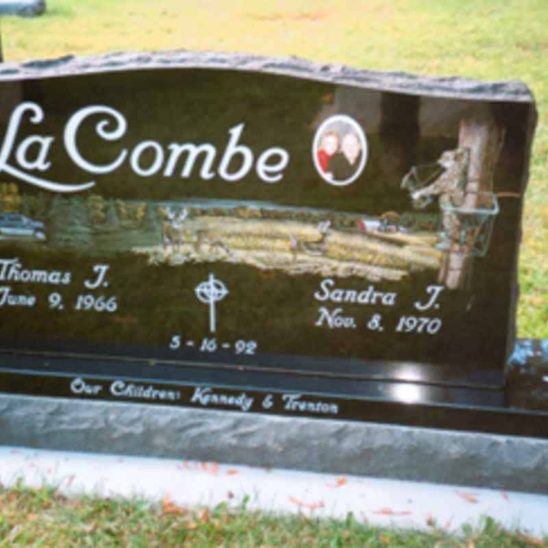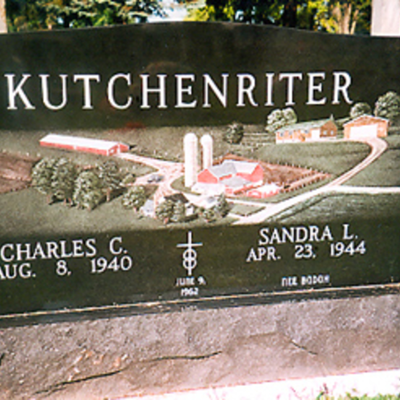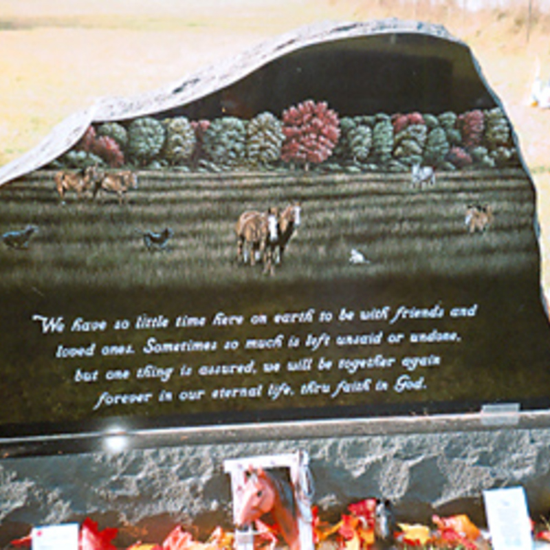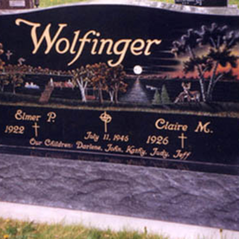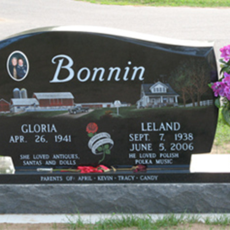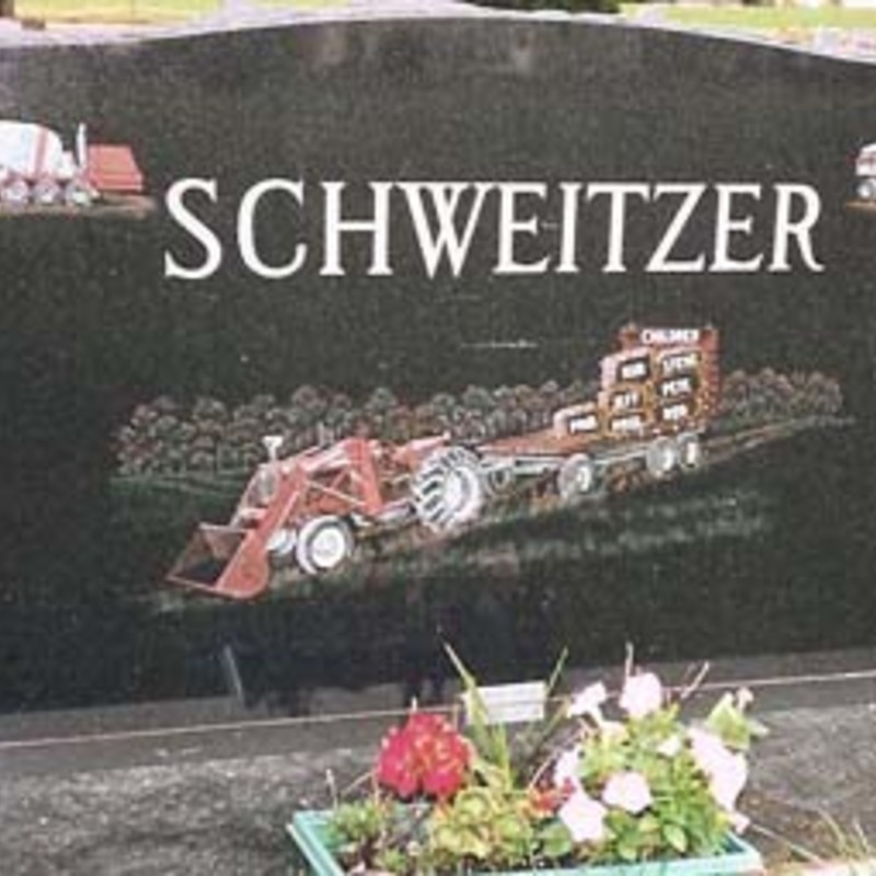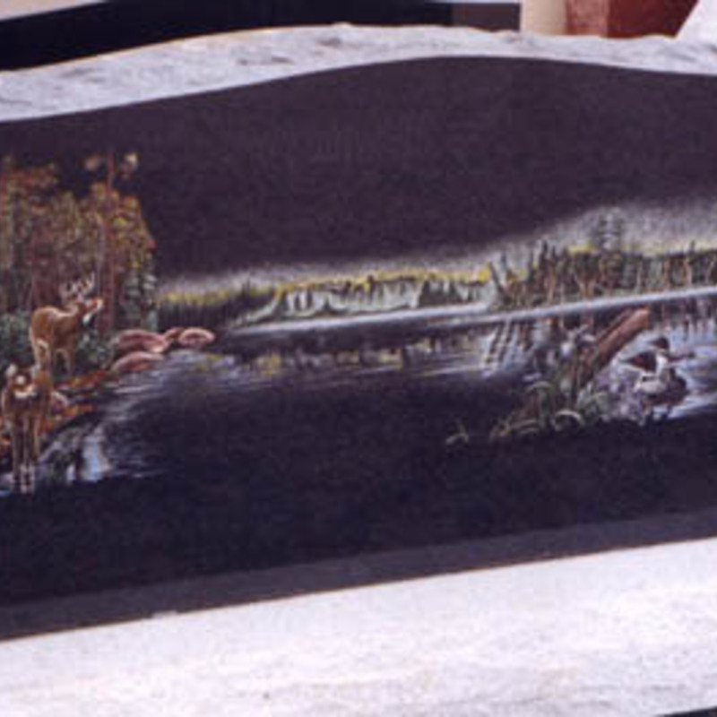 Staff artists create these very intricate etching designs. You may provide an image of your choice to personalize your monument or choose from one of our many designs including a picture of a church, a team of Belgian horses, roses, a motorcycle, an A-frame cottage or a man playing a guitar. We will help you create an image that commemorates the individual personality to whom we are paying tribute.
