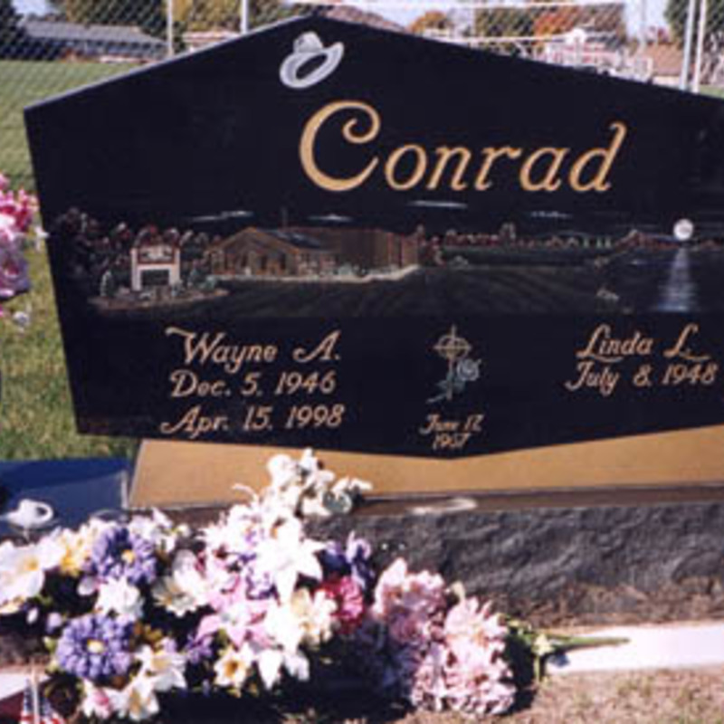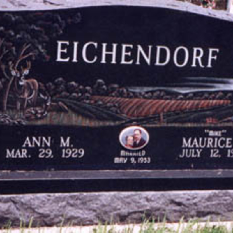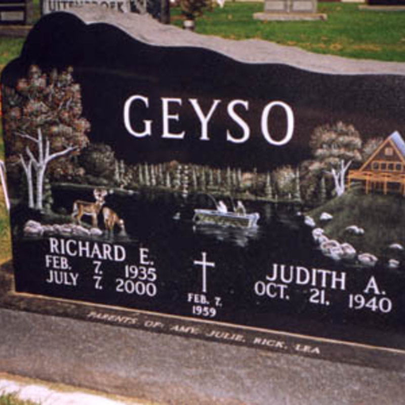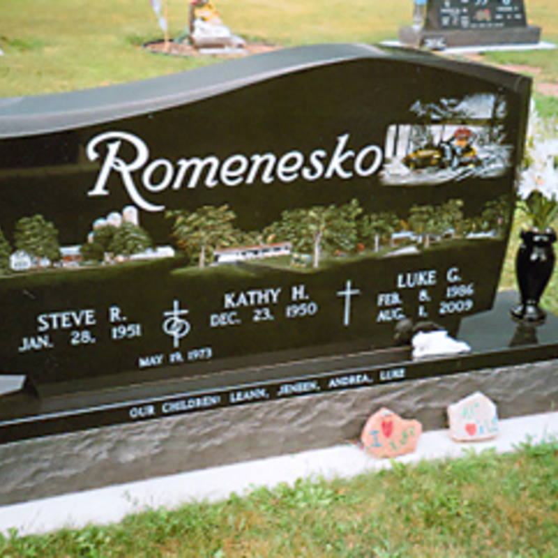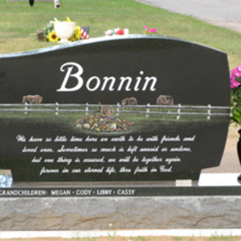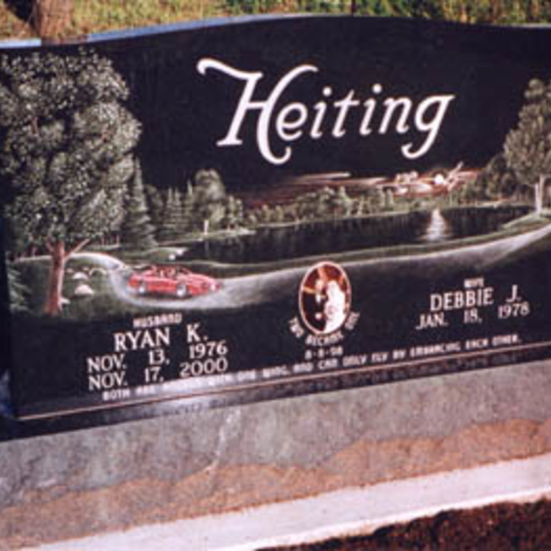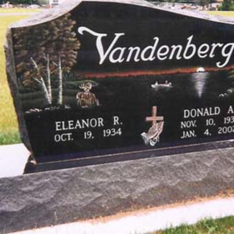 Staff artists create these very intricate etching designs. You may provide an image of your choice to personalize your monument or choose from one of our many designs including a picture of a church, a team of Belgian horses, roses, a motorcycle, an A-frame cottage or a man playing a guitar. We will help you create an image that commemorates the individual personality to whom we are paying tribute.